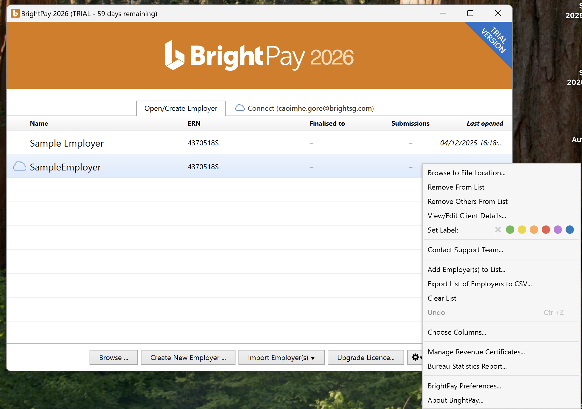 This information can be entered or edited directly via the BrightPay Open Company screen, by right-clicking on an employer and selecting the "View/Edit Client Details" menu option (this menu also includes a quick one-click link to set a label colour).