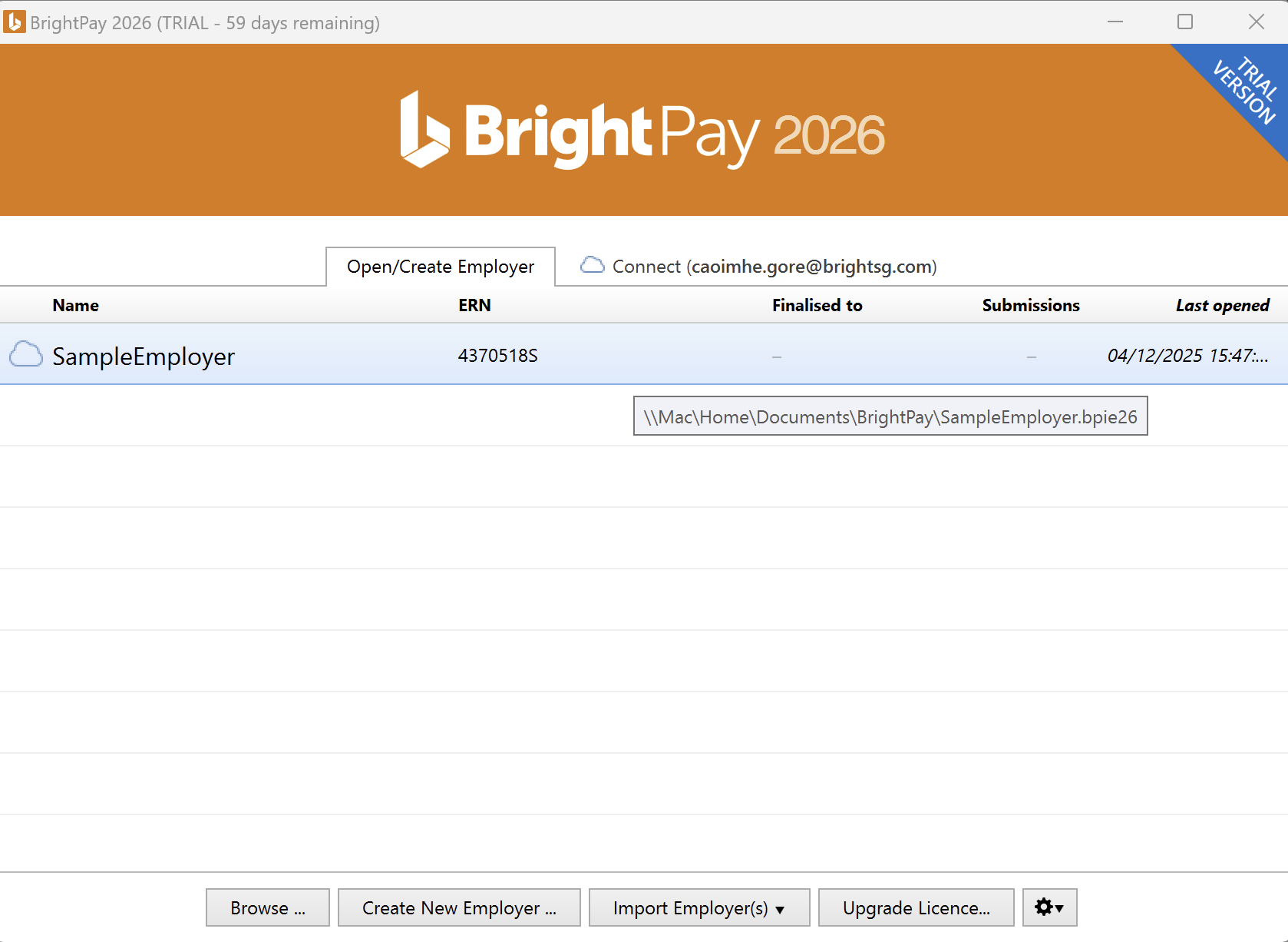 (If you are unsure where your files are located, just hover over the employer name on the BrightPay Open Employer screen and make a note of the location that will be displayed in the pop-up).