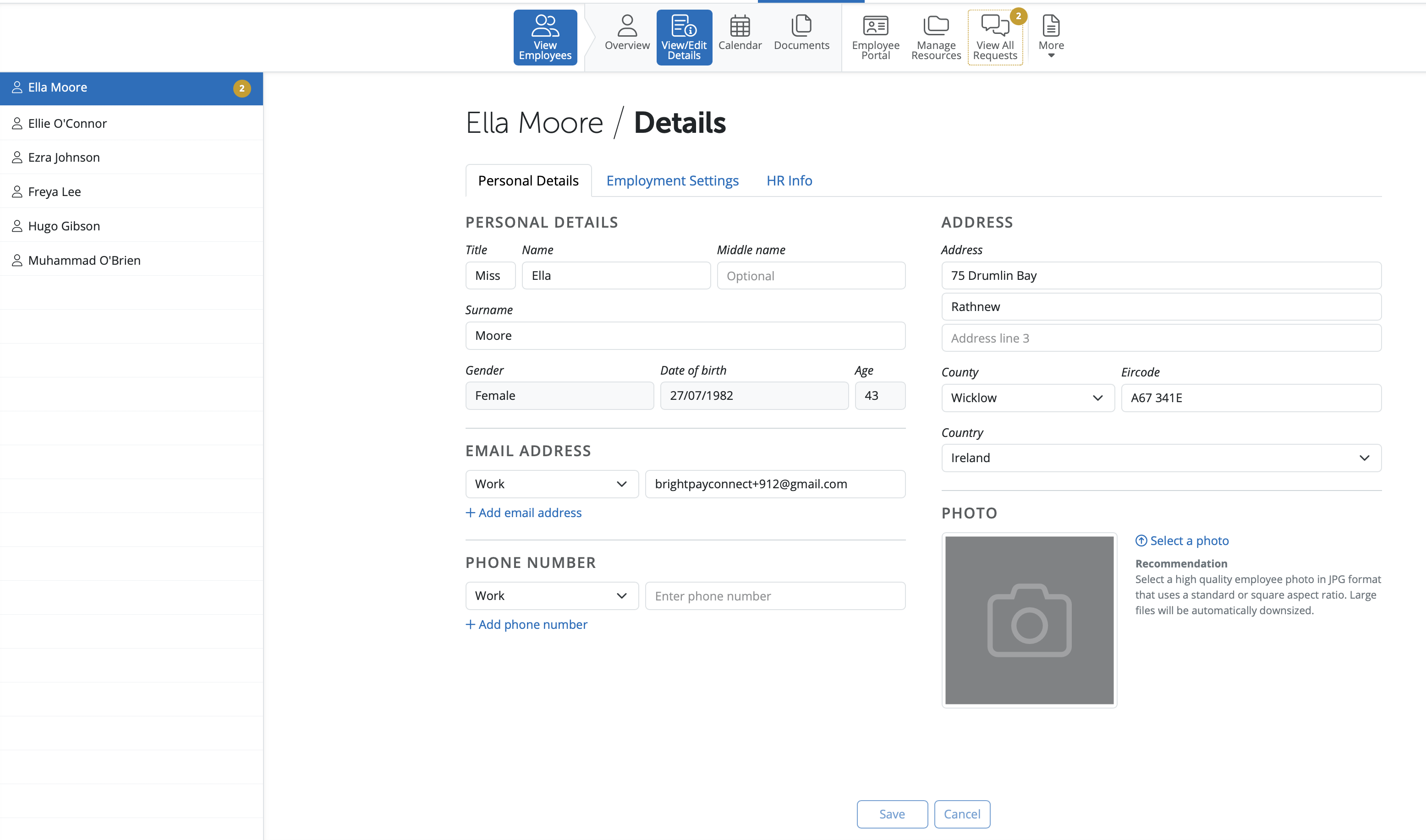 In the Employee - Personal Details section of the Client Portal a user can access basic Employee Information. This information can be edited (except the employer's name) and saved once the user has permission to do so. Details entered or any changes saved by a user will be updated in the Client Portal and in the employer in BrightPay.