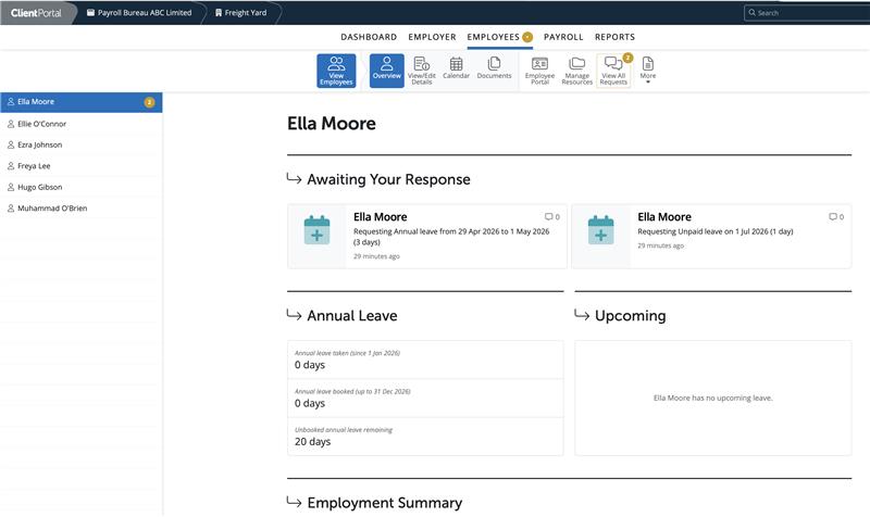Your view of an employee's dashboard views any outstanding employee leave or change of personal details requests, their annual leave entitlement and any upcoming leave for the employee.
