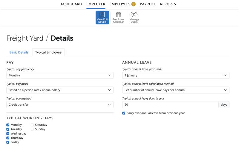 This section allows the user to create settings that will be used as the default when adding a new employee. These settings are: