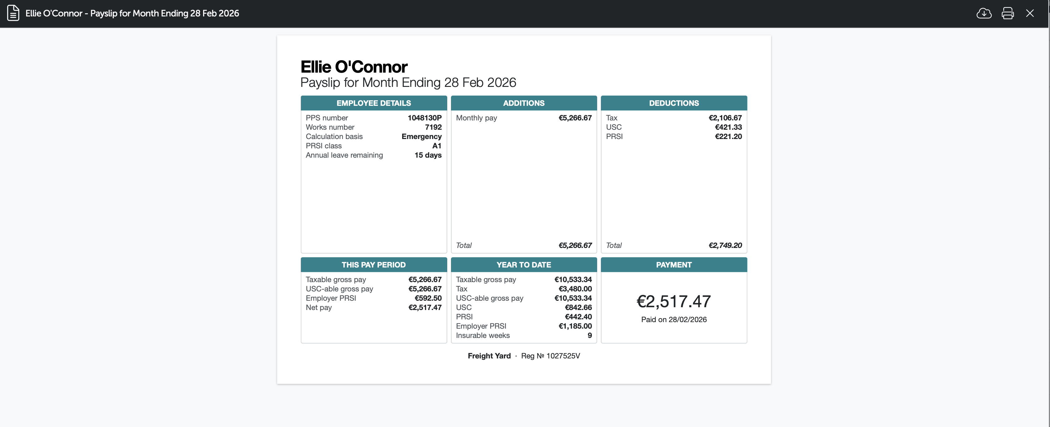 The options to download or print the payslip are available in the top right hand corner of the payslip preview window.