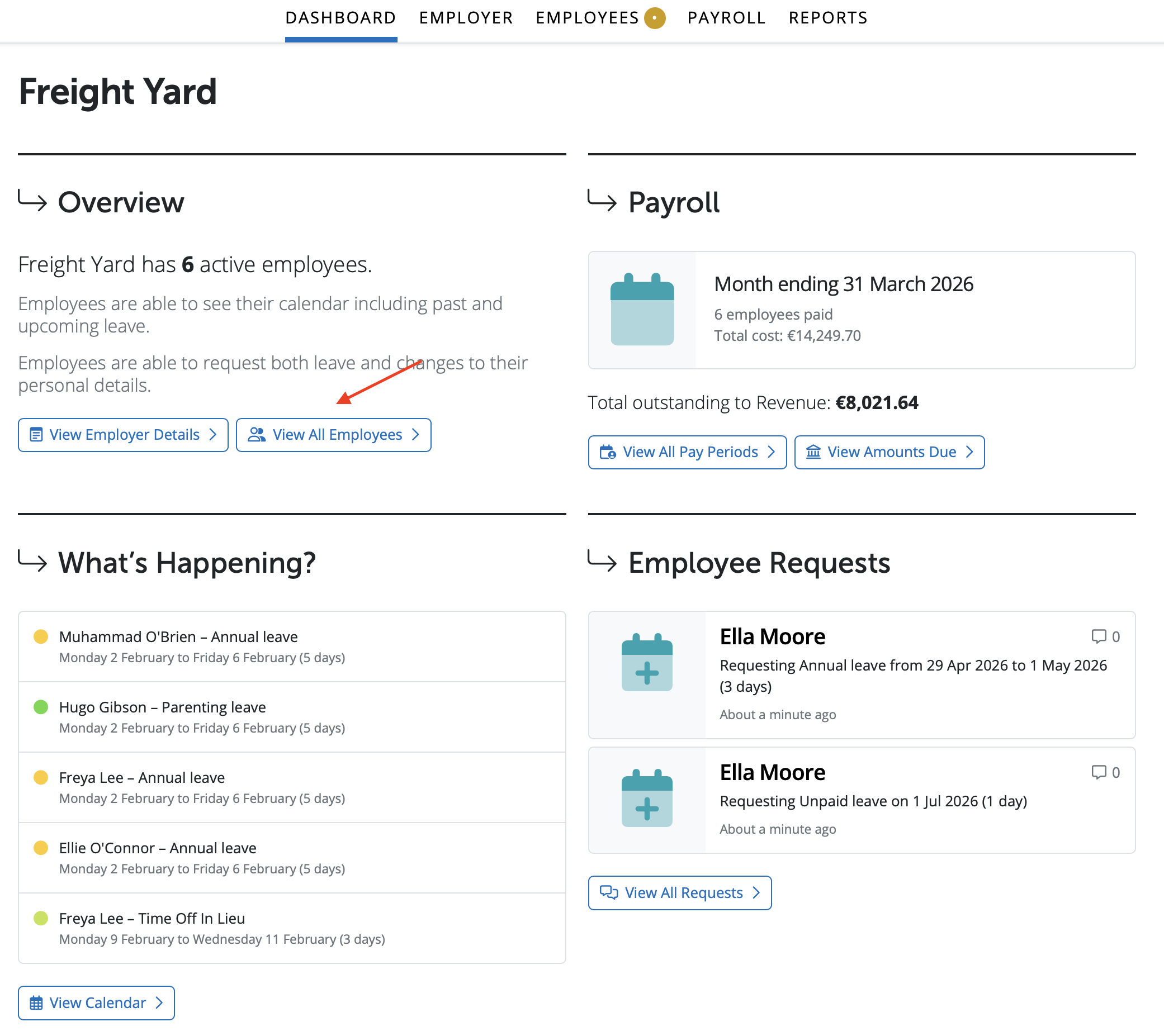 The option for 'View All Employees' can be accessed by the shortcut or by selecting the Employees tab at the top. This will bring the user to the View Employees area where the user can view/edit employees' information, view payroll documents and resources and access other areas such as the employer portal settings, manage resources and view employee requests.