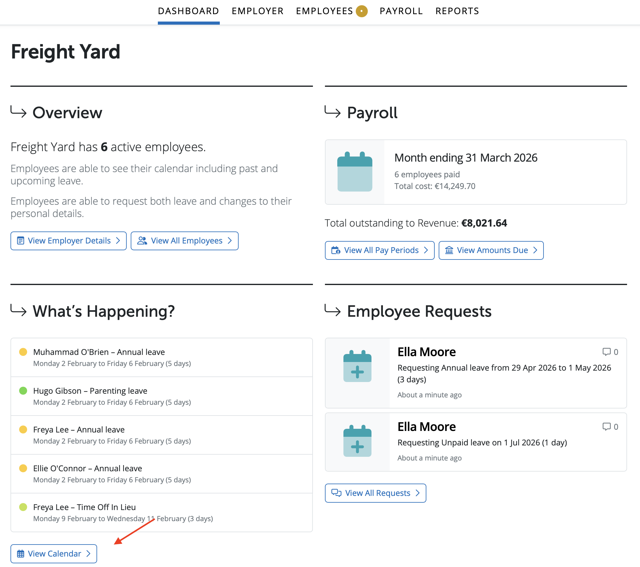 The option to access the Employer Calendar can be accessed by the shortcut 'View Calendar' or by selecting the Employer tab at the top. This will bring the user to the Employer Calendar. This is an employer-wide calendar which amalgamates all employee events along with other key payroll dates into a single view.