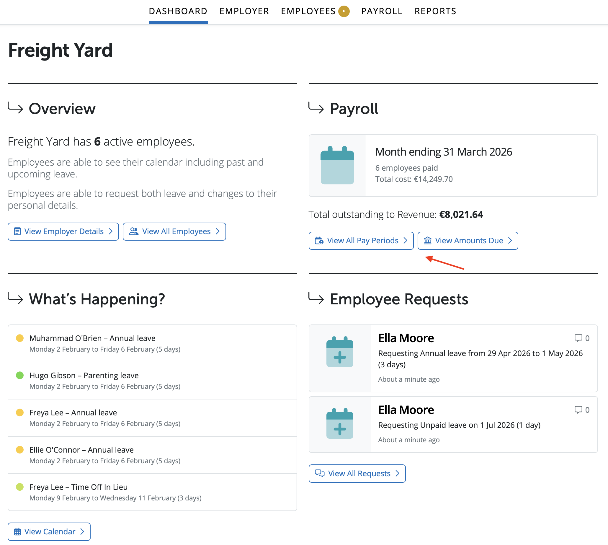 Under the Payroll area the options for 'View Amounts Due' or 'View All Pay Periods' can be accessed by the shortcut or by selecting the Payroll tab at the top. This will bring the user to the Payroll area where the user can view finalised pay periods, view payroll summary report and payslips and access the Due to Revenue where amounts due to Revenue are displayed.
