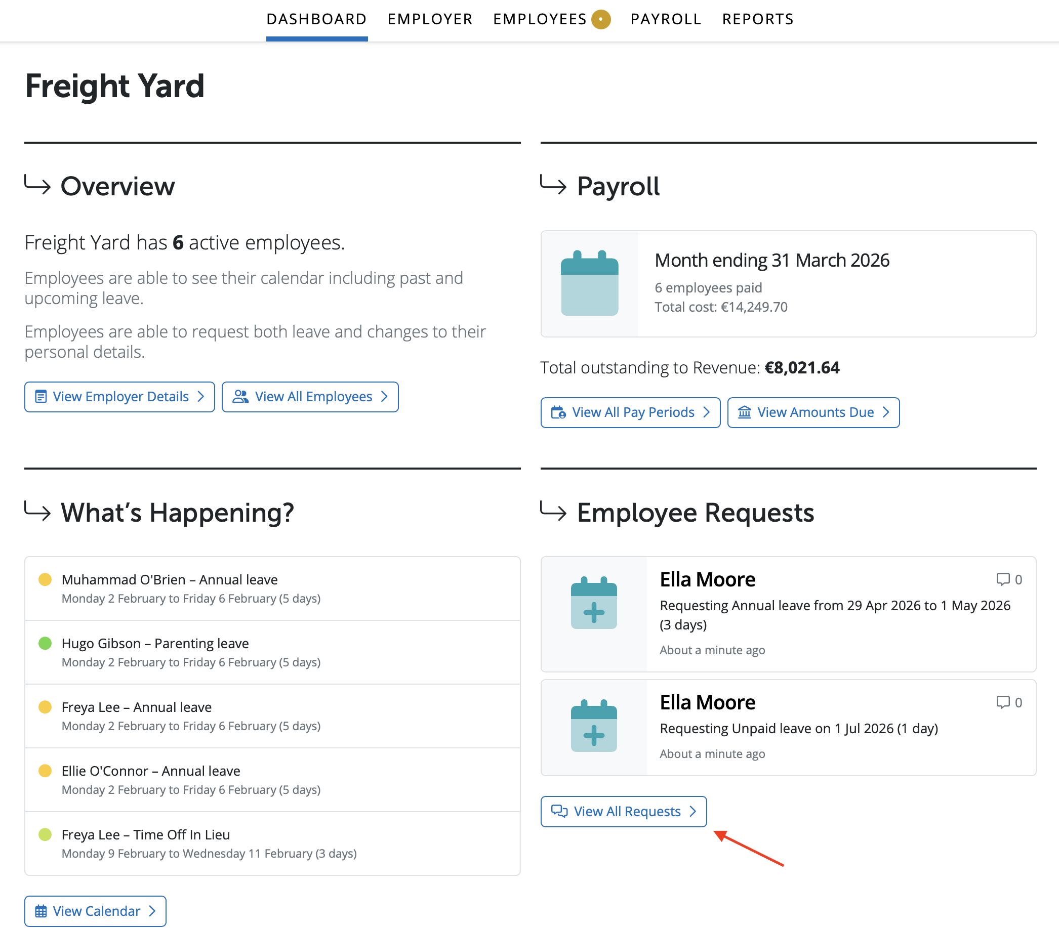Under the Employee Requests area users can view the most current employees' leave and change of personal requests. These requests and others can be accessed by the shortcut 'View All Requests'' or by selecting the Employees tab at the top. This will bring the user to the View All Requests section in the Employees area. All outstanding employee requests and history are available here.