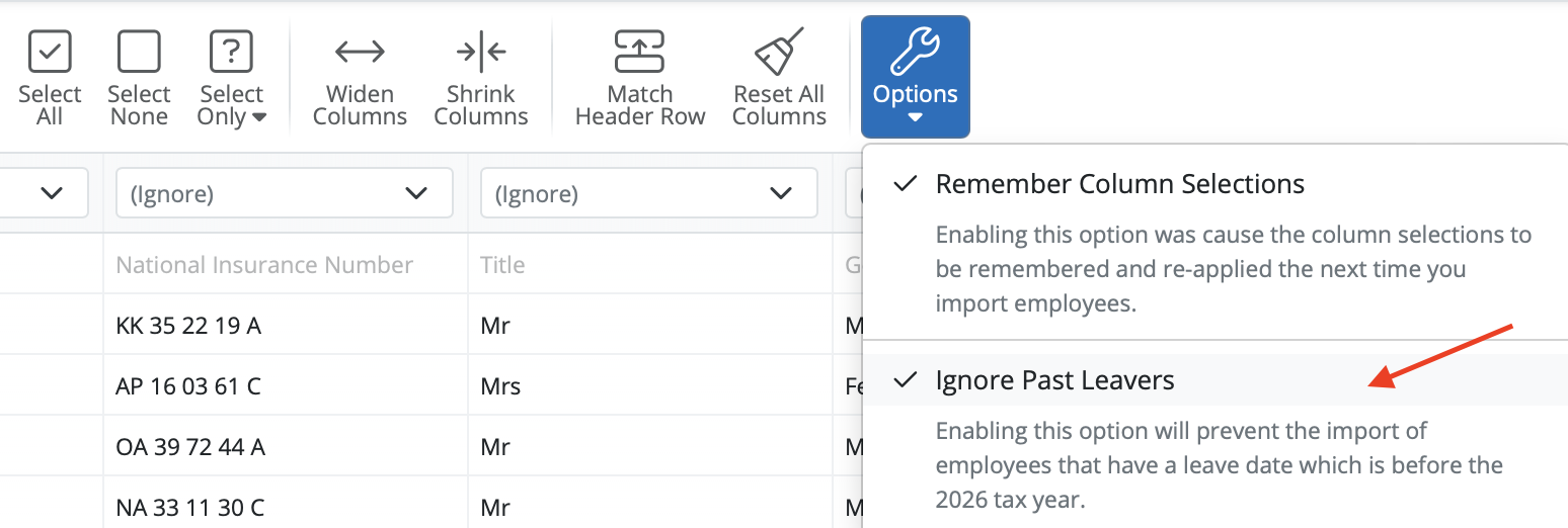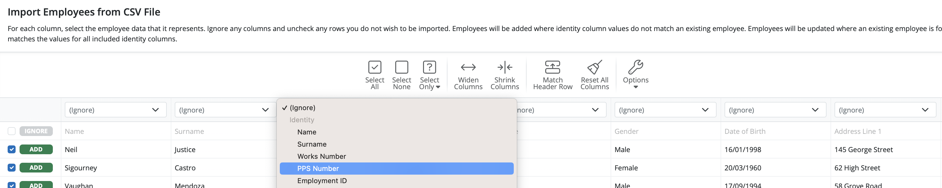 In order for BrightPay to match row data against existing employees, it will use the 'identity columns'. These 'identity columns' are: