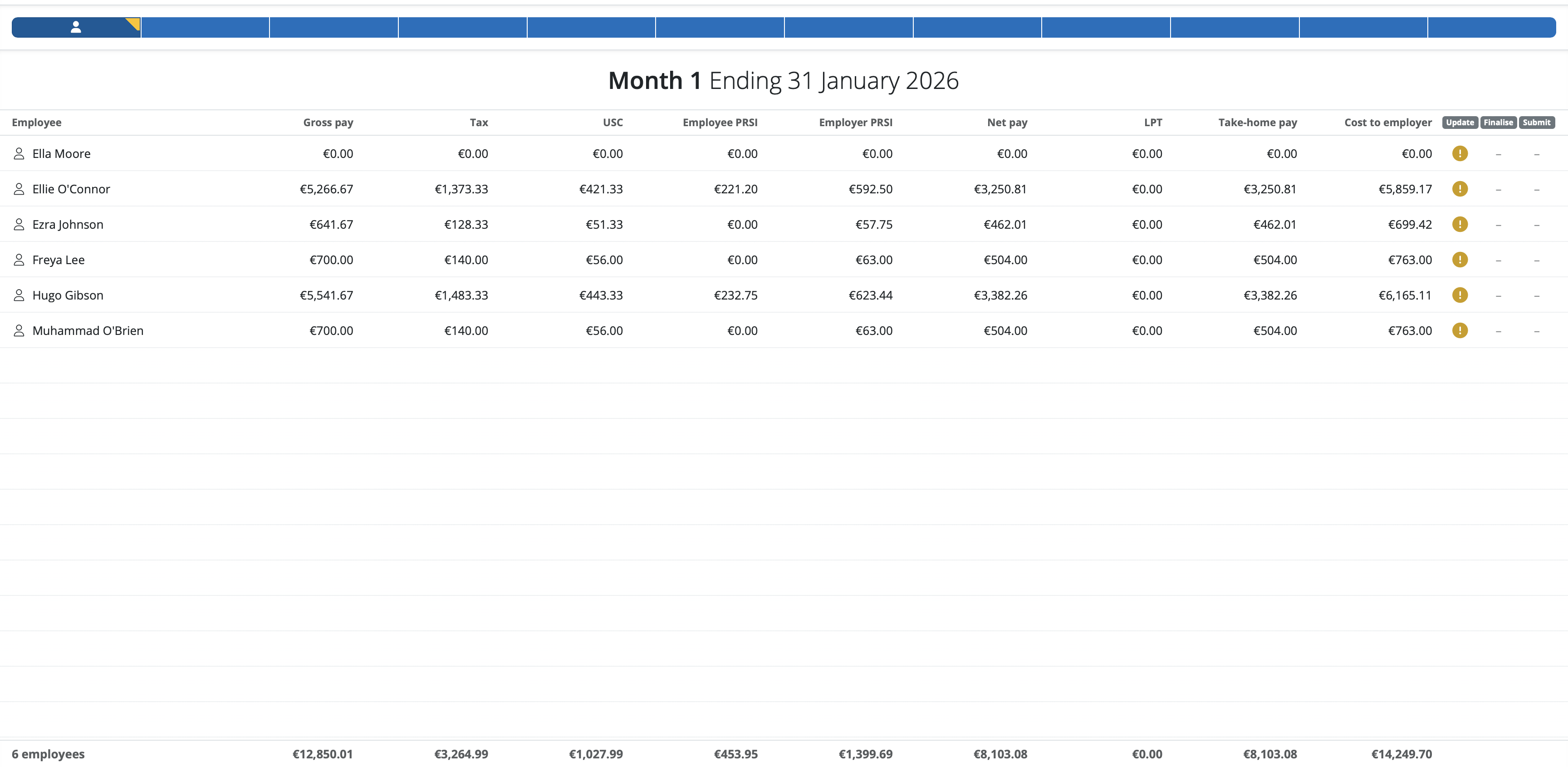 This summary view provides an overview of pay information entered in the pay period selected for all the employees on that pay frequency. It is most commonly used as a final check of pay information entered before a pay period is finalised.