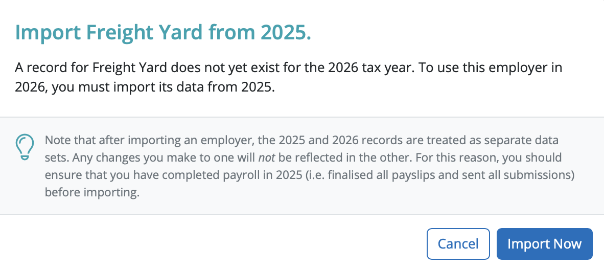 7. Select 'Import Now' and your employer will start to import into the new tax year.